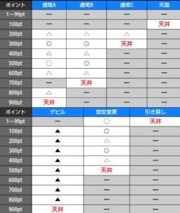 規定ポイント振り分けはモードによって異なる他、高設定ほど浅い規定ポイントを選択しやすい。